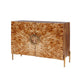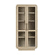 The four framed doors are inset with textured glass panels, offering a beautifully subtle contrast while keeping contents partially visible. Behind the doors, spacious shelving provides ample room for storing dinnerware, books, or curated décor. Elegant brushed brass handles add a warm, contemporary accent, enhancing the cabinet’s polished aesthetic.