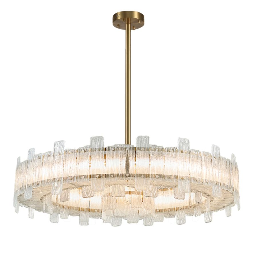 It features a drum-shaped shade with an antique brass finish that is adorned with rods of frosted glass. The frosted glass rods delicately adorn the shade, casting a soft, ambient glow when illuminated, creating a cozy atmosphere in any room. Whether used as a focal point in your living room, bedroom, or office, this drum-shaped shade exudes refined beauty and elevates the ambiance of any space.
