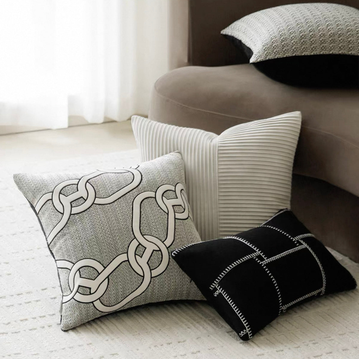 Introducing the Stitch Noir cushion, a striking addition to any home décor that marries simplicity with a bold aesthetic. This unique piece features a rich black fabric enhanced by white contrast stitching, creating a graphic pattern that draws the eye and adds a touch of modern sophistication.