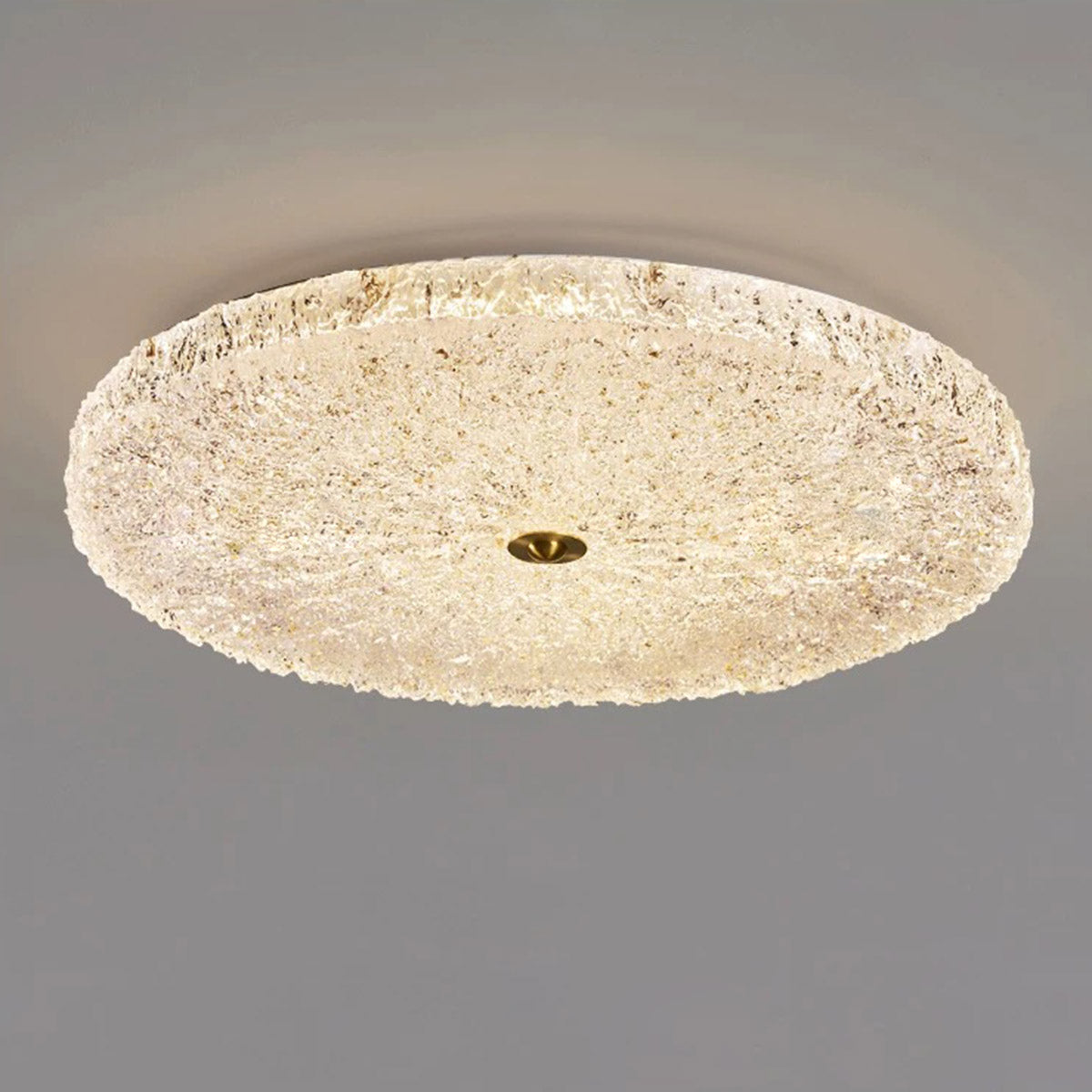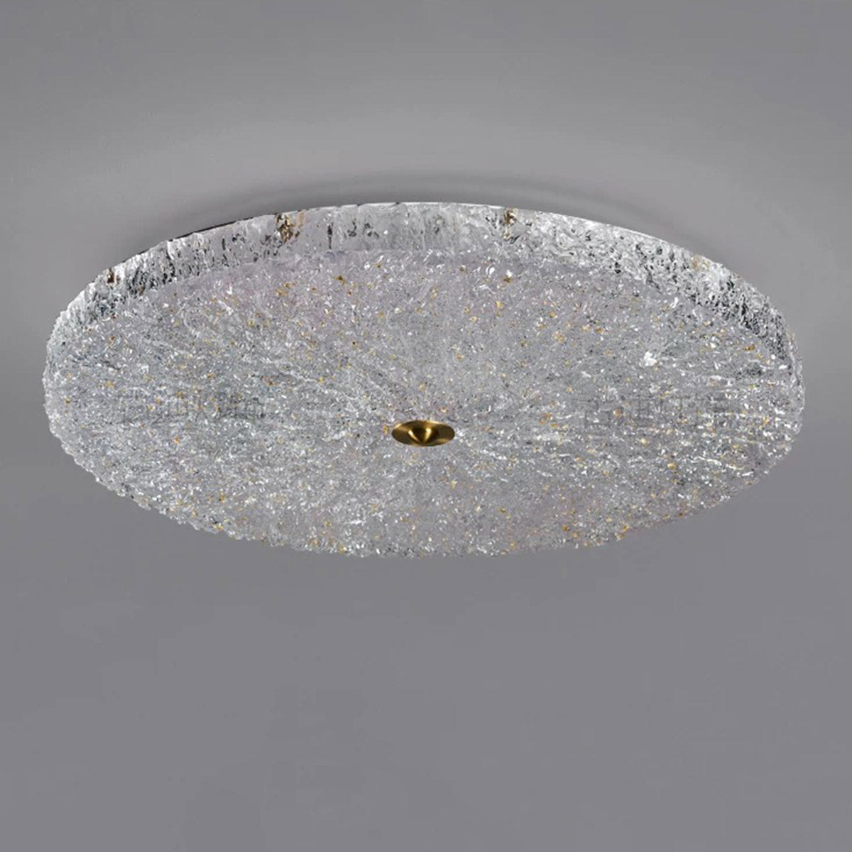 The Frost Flush Mount is designed with a dense cluster of crystalline fragments and gold leaf flakes, embedded within a subtle, circular design. This addition not only enriches the aesthetic with a touch of glamour but also adds a warm, reflective quality to the light emitted. As the light interacts with the gold flakes, it creates a radiant, inviting glow that enhances the ambiance of your space.