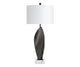 Made entirely of metal, this design's most distinctive feature is the unique and gracefully curved body. The sleek black finish adds drama that complements the overhang-style, oatmeal lamp shade. Transform your space into a gallery of contemporary art with the Celeste Table Lamp.