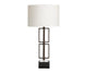 This unique piece showcases an open-metal framework design surrounding a central rod. Coated in a magnificent gunmetal/black finish, the body is a visual masterpiece that leads the eye on a journey of geometric shape and form. Seated on a stacked foundation of clear crystal and metal, the base features a plated, black onyx finish that adds an element of drama and sophistication. The design's crowning feature is a white linen shade that casts an inviting glow of light in any dedicated living, relaxing or entryway space.