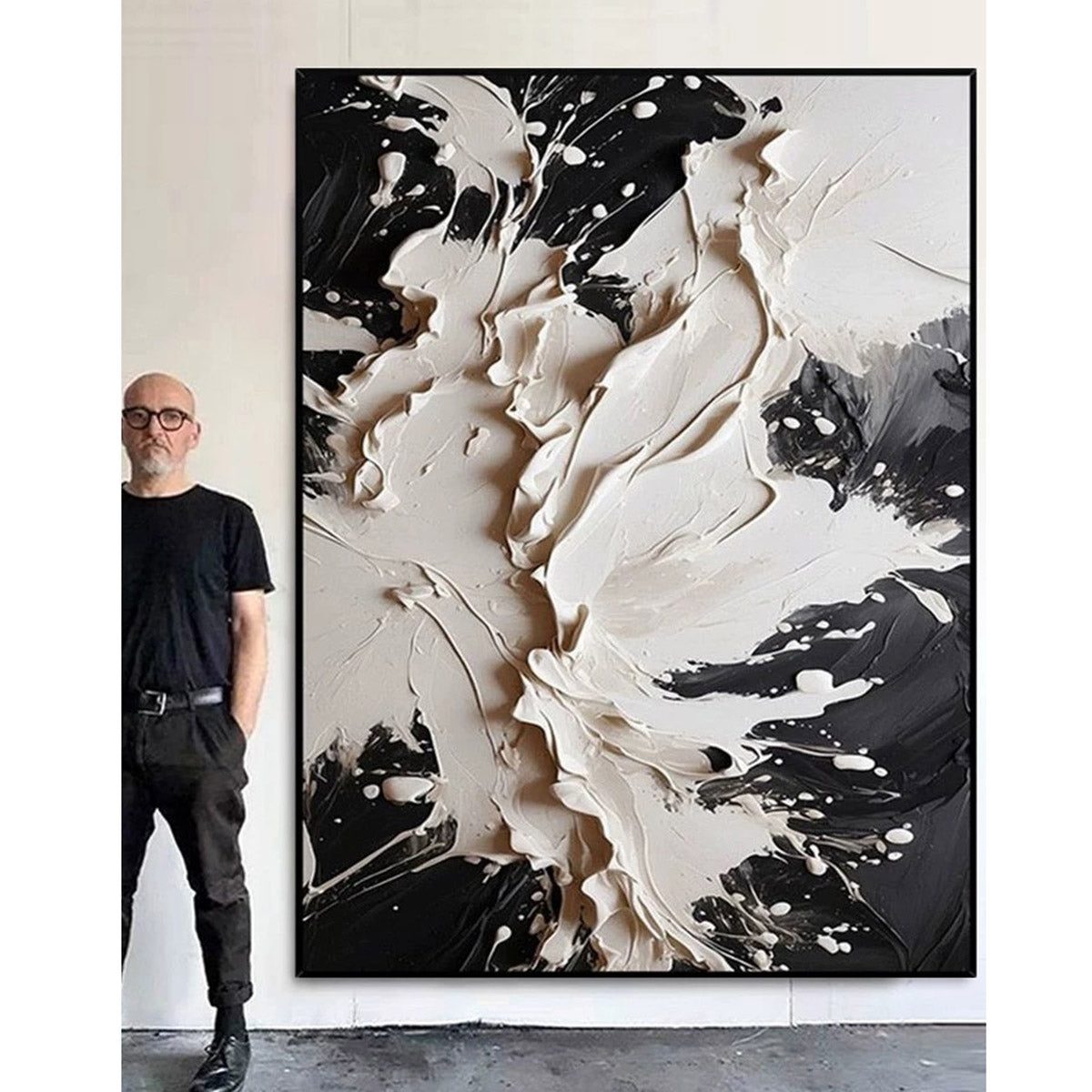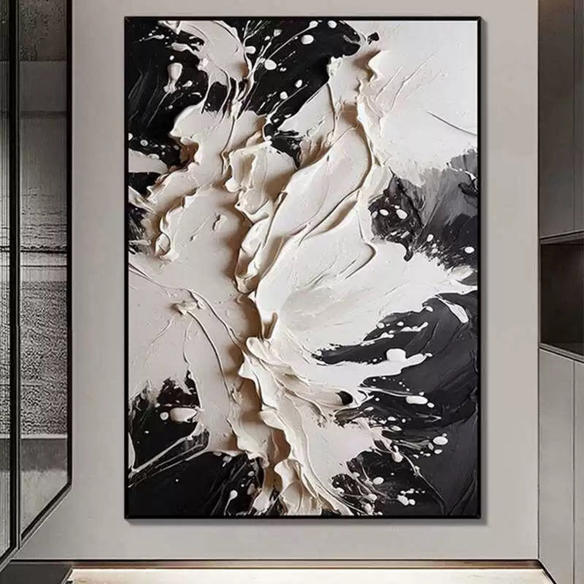 Introducing "Ethereal Contrast," an exquisite piece of abstract art that masterfully captures the dynamic interplay of light and shadow. This artwork features bold, swirling patterns of black and white, creating a striking visual effect that is both dramatic and mesmerizing. The intense blacks dive deep into the canvas, contrasting sharply against the expansive, creamy whites that seem to billow outwards, giving the impression of a tumultuous storm or a serene cloud formation.