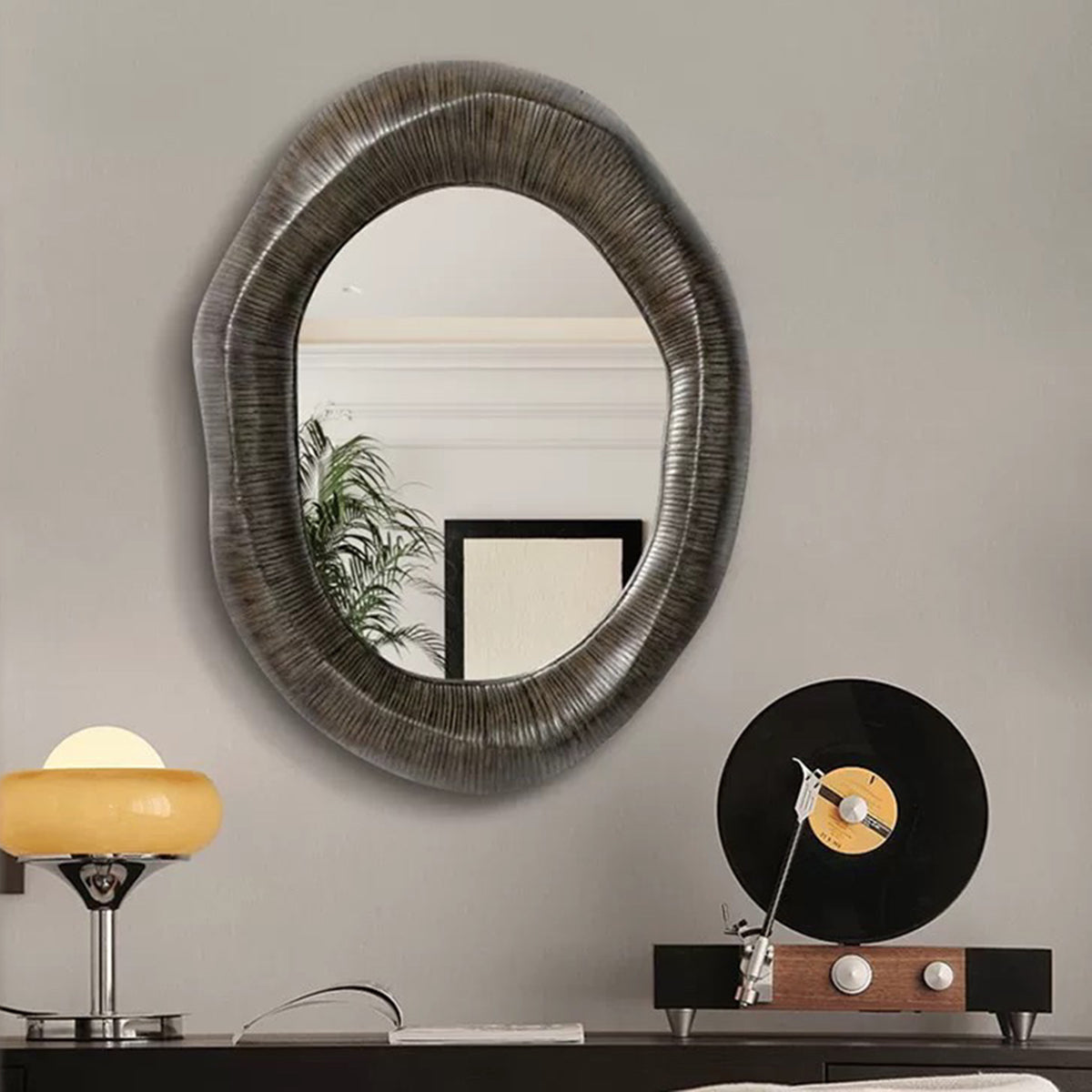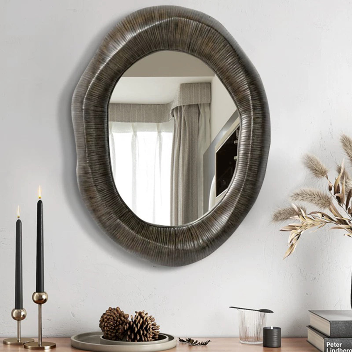 • Distinctive Textured Frame: The mirror features a beautifully textured frame with a metallic finish that mimics the natural patterns found in aged materials. The oval shape is perfectly outlined by this intricate detailing, making it a captivating focal point in any room.