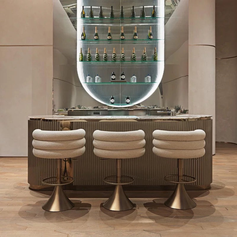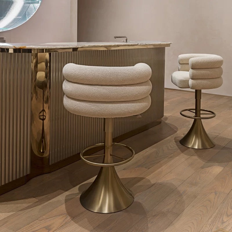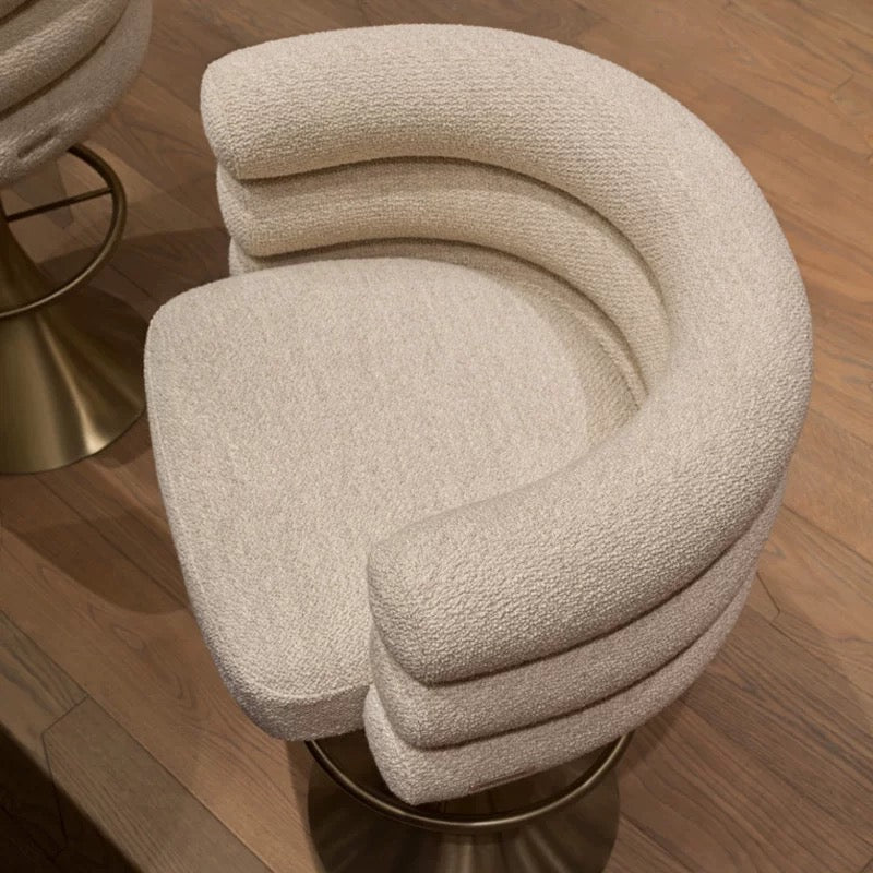 Wrapped in plush ivory bouclé, Camille offers tactile warmth and visual softness — a perfect contrast to its metallic silhouette. The swivel seat and height-adjustable mechanism bring modern functionality to timeless form, creating a piece that feels both nostalgic and new.